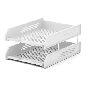 Փաստաթղթեր, ամսագրեր և կատալոգներ պահելու համար նախատեսված սկուտեղների աշխատասեղան: Պատրաստված է բարձրորակ պլաստիկից։ Հավաքածուն ներառում է 6 մետաղական պտուտակներ՝ 4 հատ սկուտեղներ իրար վրա տեղադրելու համար և 2 պահեստային կապիչներ՝ նույն ապրանքի սկուտեղների լրացուցիչ գնված հավաքածուն տեղադրելու համար: