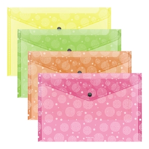 Կոճակով ծրարի թղթապանակ, A4 ֆորմատի, պատրաստված բարձրորակ կիսաթափանցիկ պլաստիկից՝ «հայելային» մակերեսի հյուսվածքով, որը չի երևում մատնահետքեր և մանր քերծվածքներ։ Նախատեսված է փոքր քանակությամբ փաստաթղթեր պահելու և տեղափոխելու համար: Թղթապանակի գույնը՝ տեսականի՝ վարդագույն, կապույտ, անանուխ, մանուշակագույն։ Անվտանգ դիպուկ փակումը ապահովում է փաստաթղթերի արագ մուտք: Թղթապանակը պահում է մինչև 120 թղթի թերթ: Չափսը՝ 232x333մմ, հաստությունը՝ 0.18մմ։ Առկա է տարբեր գույների՝ առանց ընտրության: Կոդ և շտրիխ կոդ յուրաքանչյուր ապրանքի վրա: